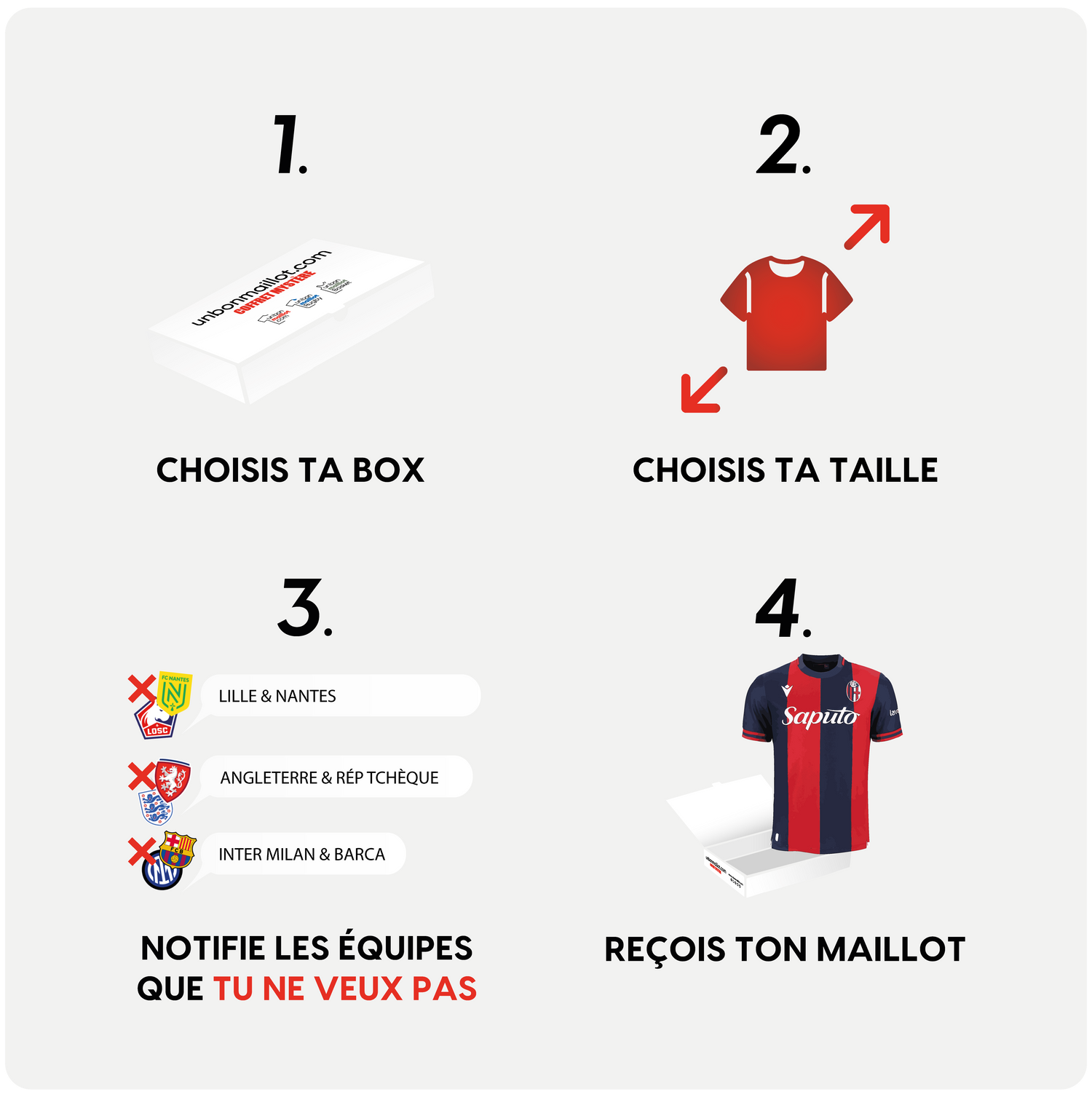Allez-vous recevoir un bon maillot ? Choisissez simplement votre taille et élargissez votre collection de maillots avec Unbonmaillot.com. Dans votre coffret, vous recevrez au hasard un maillot mystère choisi par nos soins.